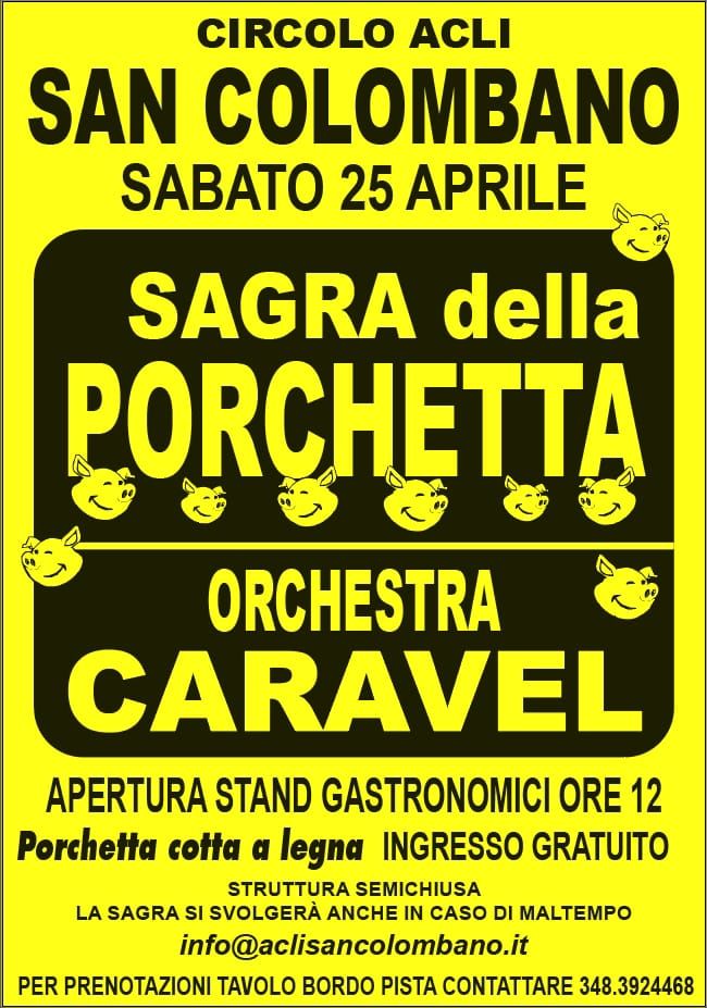 Sabato 25 aprile 2026, festa della Liberazione, è in programma la Sagra della Primavera, organizzata dal Circolo Acli San Colombano. Apertura degli stand gastronomici alle ore 12 (con la porchetta cotta a legna), mentre nel pomeriggio si balla con i Caravel.