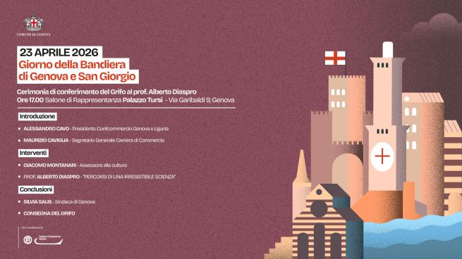 In occasione del Giorno della Bandiera di Genova e di San Giorgio, nella giornata di giovedì 23 aprile 2026, alle ore 17, nel Salone di Rappresentanza di Palazzo Tursi, si tiene la cerimonia di conferimento del Grifo al professor Alberto Diaspro.