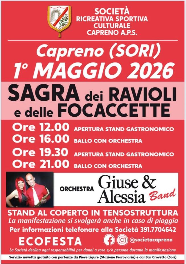 Con la la primavera che entra nel vivo, tornano le sagre a Genova e provincia. A Capreno di Sori si rinnova l'appuntamento con la Sagra dei ravioli e delle focacette, in programma venerdì 1 maggio 2026. Apertura dello stand gastronomico alle ore 12, mentre alle ore 16 e poi alle 21 largo alle danze e alla musica con l'orchestra Giuse & Alessia Band. Lo stand gastronomico dove gustare focaccette e ravioli a volontà apre anche la sera, alle ore 19.30. Stand al coperto in tensostruttura.