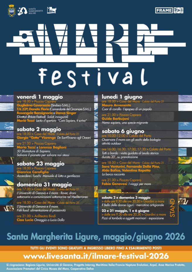 «Con la seconda edizione de IlMare Festival abbiamo ridisegnato il concept e il format di un evento a elevata valenza culturale», commenta Guglielmo Caversazio, Sindaco del Comune di Santa Margherita Ligure, «distribuendolo su più weekend e portandolo sia nella ritrovata agorà di Piazza Caprera, spazio privilegiato di incontro e dibattito, sia alla Casa del Mare di Calata del Porto, che in questi giorni restituiremo – rinnovata – alla comunità. Santa Margherita è una città che è una col suo porto e col suo litorale, che vive di mare e che sul mare deve continuare a costruire il proprio futuro e la propria identità socio-economica».