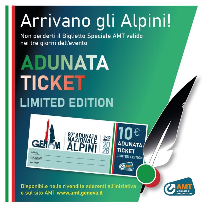 In occasione della 97esima Adunata Nazionale degli Alpini a Genova (leggi qui il programma completo), Amt (il servizio di trasporto pubblico cittadino e provinciale) ha creato un biglietto speciale per spostarsi in città durante tutto il weekend dell'evento.