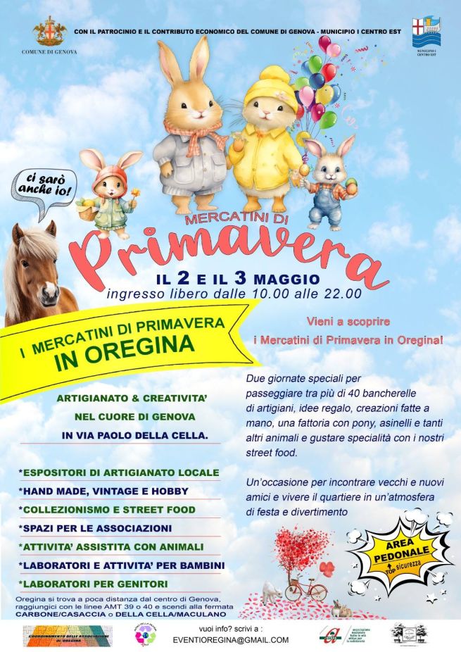 I Mercatini di Primavera sono facilmente raggiungibili dal centro di Genova utilizzando i mezzi pubblici: linee Amt bus 39 o 40 (fermate consigliate: Carbone/Casaccia oppure Della Cella/Maculano). Per maggiori informazioni è possibile scrivere all'indirizzo e-mail: eventioregina@gmail.com. Di seguito la locandina dell'evento.