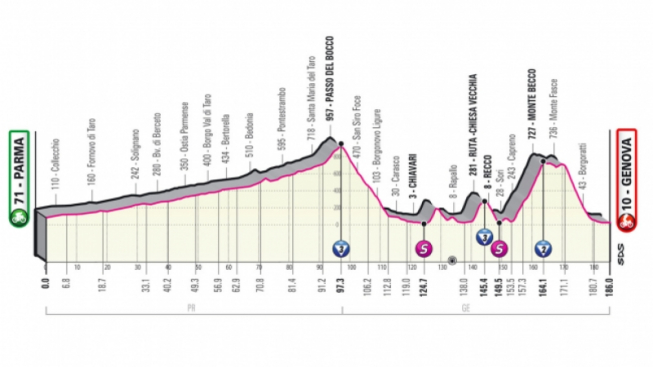 La tappa del Giro d'Italia 2022 che, da Parma, porta i campioni del ciclismo a Genova copre una distanza di 186 km con un dislivello di 2840 metri, con una prima parte di salita costante che ha il suo picco a 957 metri, al passo del Bocco, proprio al confine tra Emilia-Romagna e Liguria. Da lì, inizia una discesa veloce di 15 km in direzione di Chiavari (passando per Montemoggio, San Siro Foce, Borgonovo Ligure e Carasco) fino alla costa; si imbocca l'Aurelia e si arriva a Rapallo, dove per i corridori si presentano le maggiori difficolta altimetriche con Ruta affrontata dal versante di Chiesa Vecchia. Poi si passa da Recco e Sori, dove arriva l'inedita - e molto impegnativa - salita del Monte Fasce fino al Cornua e poi al Monte Becco, passando per Capreno. Questa 'scalata', collegandosi al Monte Fasce dovrebbe sfoltire il gruppo che arriva a Genova per contendersi la volata finale, passando da Borgoratti. Il traguardo, probabilmente, sarà a De Ferrari.
