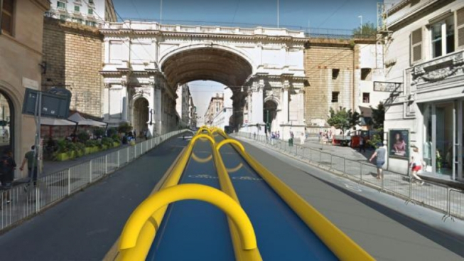 Lo scivolo d'acqua gonfiabile che vedremo a Genova è il più grande costruito in Italia, proprio per questa occasione. Sarà montato la notte prima dell’evento, venerdì 6 luglio 2018, in cima a via XX Settembre. Gli operai posizioneranno una struttura più alta per la partenza, con lo scivolo steso sino in fondo alla strada di via Venti. La velocità per la scivolata sarà garantita alla partenza in modo artificiale, poi mantenuta grazie alla pendenza (piuttosto leggera) della strada. Per quanto riguarda il ciclo dell’acqua, sarà garantito da compressori e da un sistema di riciclo che la raccoglierà sul fondo e la rimetterà poi in circolo, in modo da riciclarla.