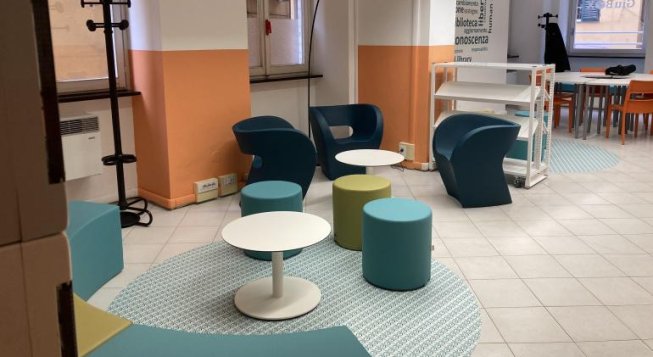 Disposto su circa 70 mq di ampiezza, lo spazio è stato attrezzato con arredi di vario genere, in modo da creare diverse aree funzionali da utilizzare a seconda delle esigenze dell’utenza. Sono presenti tavolini componibili e consolle con sedie, poltroncine, panche imbottite, pouf, cuscini, uno schermo a parete.