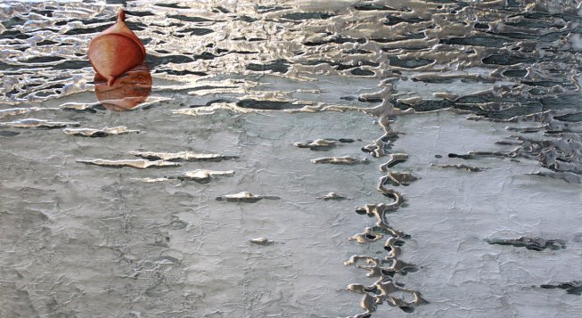 Protagonista delle opere di Alberti è il tema dell’acqua, declinato dall’artista in infinite variazioni, come in una sinfonia nella quale si alternano suggestioni, sollecitazioni, poesia. Sono opere la cui natura oscilla tra il dipinto e la scultura, realizzate con una tecnica del tutto personale fatta di stucchi, rilievi in metallo e leggere velature di colore che rendono la trasparenza e la dinamicità dell’acqua, elemento protagonista, per Alberti, di una lunga ricerca cromatica e materica oltre che espressiva. Una ricerca che si interroga su ciò che appare e ciò che traspare, obbligando gli spettatori ad avvicinarsi e a retrocedere dalle opere, "costringendoli" a cambiare di continuo il punto di vista, mettendo alla prova la loro percezione.