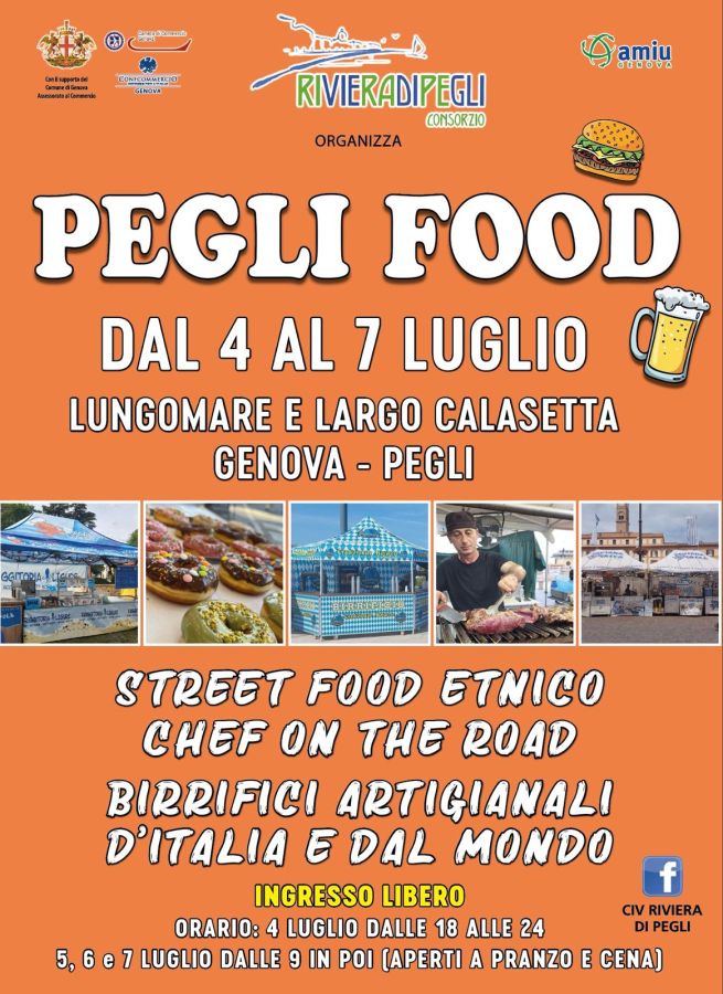 Appuntamento con la terza edizione di Pegli Food, che aspetta genovesi e turisti sul lungomare di Pegli da Largo Calasetta e nel corridoio dei Giardini Peragallo. Da giovedì 4 a domenica 7 luglio 2024 si possono trovare street food con cibi del mondo, chef on the road e birrifici artigianali d'Italia e non solo.