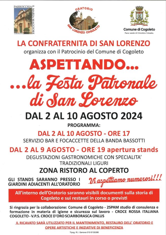 La festa di Cogoleto, prevista sabato 10 agosto, inizia in anticipo con Aspettando la festa patronale di San Lorenzo, evento organizzato dalla Confraternita di San Lorenzo con il patrocinio del Comune di Cogoleto.