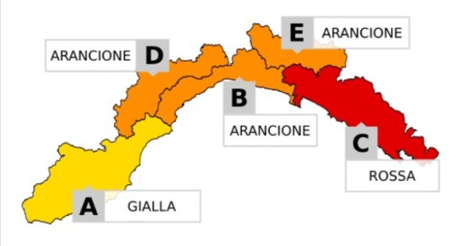 Forte ondata di maltempo in Liguria. L'allerta meteo gialla per temporali su B, C, D ed E, alle ore 22 di lunedì 7 ottobre 2024, diventa arancione per temporali (il massimo grado). Nella zona centrale della regione, che comprende Genova e il suo entroterra, l'allerta arancione termina alle ore 21 di martedì 8 ottobre (poi gialla fino a mezzanotte). Dalle 24, nel Ponente della Liguria (zona A), scatta l'allerta gialla (ancora per temporali, fino alle 18). Dalle ore 12 di martedì 8 ottobre 2024, e poi per tutta la giornata, l'allerta meteo diventa rossa sui bacini grandi di Levante per piogge diffuse (ovvero la zona C, da Portofino a Sarzana e Luni. Sui bacini medi e piccoli l'allerta resta arancione). Per la zona C, segue allerta gialla fino alle 6 di mercoledì 9 ottobre. Seguiranno aggiornamenti. Di seguito le previsioni meteo a Genova e in Liguria con il bollettino dell'allerta.
