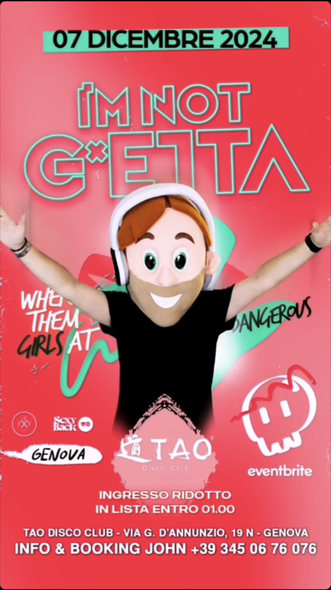 Sabato 7 dicembre 2024, al Tao Disco Club tributo al dj francese David Guetta con I'm Not G*etta. Ingresso ridotto se in lista entro l'1. Di seguito la locandina con i contatti e le informazioni.