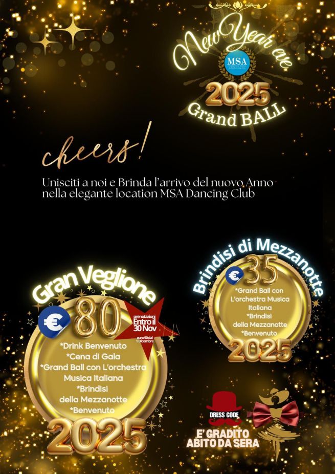 Presso la MSA Academy del Centro Commerciale Terminal Traghetti di Genova si festeggia il Capodanno 2025. Ci sono ancora pochi posti. Per la prenotazione contattare il numero (anche via WhatsApp) 3343313254. Il parcheggio è gratuito. Di seguito la locandina dell'evento con le informazioni per partecipare.