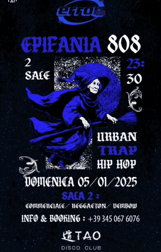 Domenica 5 gennaio 2025, al Tao Disco Club, si festeggia l'Epifania con una serata urban, trap e hip hop. In sala 2 musica commerciale, dembow, reggaeton. Di seguito la locandina dell'evento con le info di contatto