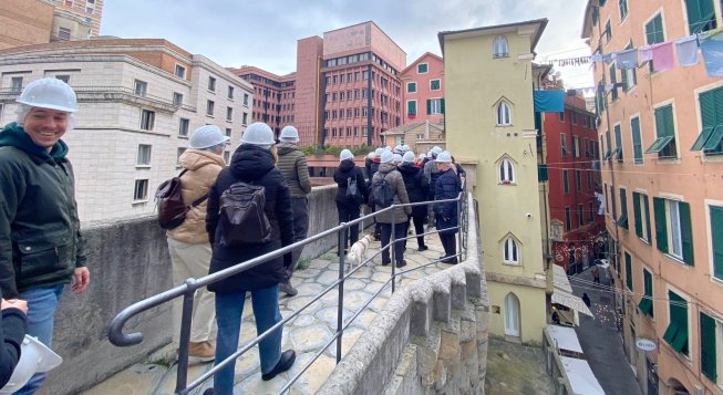 Gli ospiti, accompagnati da un operatore dellìArea Educativa della Cooperativa Solidarietà e Lavoro, partecipano a un percorso di approfondimento di Casa Colombo, per poi proseguire la vista al Chiostro di Sant'Andrea. In questa seconda tappa è possibile ammirare i magnifici capitelli scolpiti con scene di ispirazione diversa. La passeggiata continua attraverso Porta Soprana, il grandioso ingresso alla città per chiunque giungesse a Genova dal Levante, per poi salire sulle Mura del Barbarossa, le nuove mura cittadine costruite nel XII secolo per difendere l'autonomia della Repubblica di Genova dalle mire espansionistiche dell'imperatore Federico Barbarossa. Al termine della visita, sotto le maestose Mura segue una degustazione di prodotti tipici liguri offerta da Pesto per Amore, un'azienda locale che dal 2006 produce pesto e non solo, nel cuore di Genova: focaccia, pesto, olive taggiasche e un calice di vino ligure. Evento in collaborazione con il Comune di Genova e il Progetto di Comunità per il Centro Storico.