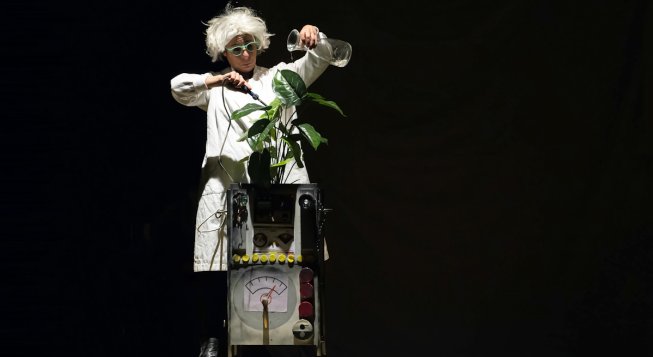 Il linguaggio utilizzato nello spettacolo è principalmente quello del teatro di figura: mediante l’utilizzo di pupazzi, oggetti animati e ombre cinesi la sola attrice Fiona Dovo è in grado di restituire al pubblico una ricca varietà di personaggi e scene di grande impatto. Tra risate, poesia e magia sarà presente anche un momento dedicato all’educazione ambientale in cui il buffo scienziato spiegherà le proprietà dell’acqua e delle piante. La scenografia è composta da materiale riciclato, materiale povero di varia origine che grazie all’uso fantasioso si trasforma fiabescamente in immagini, visioni strampalate e buffe, quadri plastici di un movimento della fantasia.