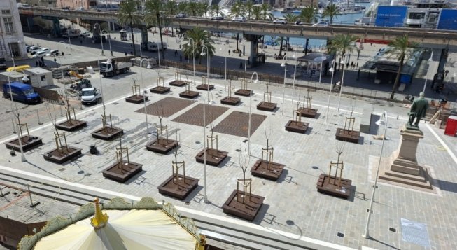 Come si presenta la nuova piazza Caricamento di Genova? Rimosso il cantiere, si nota lo sviluppo di una porzione della piazza totalmente accessibile in elevazione rispetto al piano di calpestio precedente. A catturare maggiormente l'attenzione sono però i ventidue alberi di Jacaranda sostenuti momentaneamente da paletti e posizionati in vasconi di cemento, dotati di un sistema idrico.