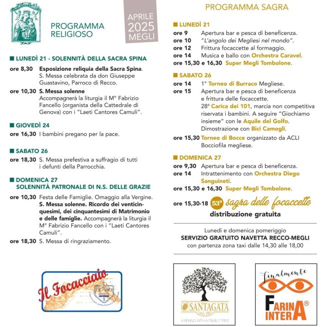 La 53esima edizione della Sagra delle Focaccette di Megli prevede anche un programma religioso con Sante Messe ed eventi liturgici dal 21 al 27 aprile 2025 (consultabile sulla pagina facebook Sagra Focaccette Megli, insieme a informazioni e aggiornamenti). Lunedì e domenica pomeriggio è attivo il servizio gratuito navetta Recco-Megli con partenza zona taxi dalle ore 14.30 alle 18. In caso di maltempo, il programma potrebbe subire delle modifiche. Di seguito la locandina con il programma completo della Sagra delle Focaccette di Megli 2024, tra gastronomia e cerimonie religiose.