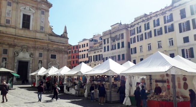 In piazza Matteotti, durante il periodo pasquale, sono presenti 26 operatori di merci varie in arrivo di tutta Italia con i loro prodotti tipici dolci e salati, i manufatti artigianali e di pelletteria. Si ringraziano per la collaborazione il Comune di Genova e Polizia municipale e Genova Parcheggi per il supporto.