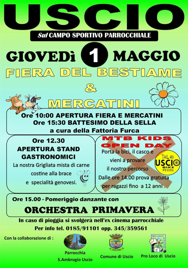 Giovedì 1 maggio 2025, festa dei lavoratori, appuntamento con la Fiera del Bestiame a Uscio, sul Campo Sportivo Parrocchiale. Dalle ore 10, apertura della fiera e dei mercatini, mentre alle 12.30 aprono gli stand gastronomici con grigliata mista di carne, costine alla brace e specialità genovesi.