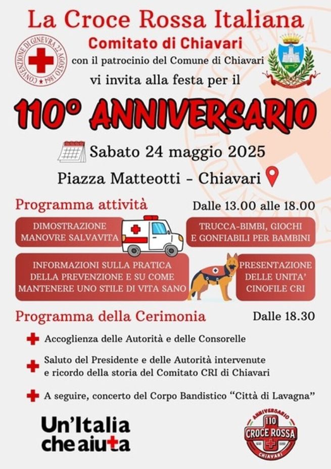 La Croce Rossa di Chiavari compie 110 anni e festeggia sabato 24 maggio 2025, in piazza Matteotti, con un ricco programma di attività. Dalle ore 13 alle 18 sono previsti: trucca-bimbi, giochi e gonfiabili per bambini; informazioni sulla pratica della prevenzione e su come mantenere uno stile di vita sano; presentazione delle unità cinofile CRI; dimostrazione delle manovre salvaviva. Segue, dalle 18.30, la cerimonia con il concerto del Corpo Bandistico ''Città di Lavagna''.