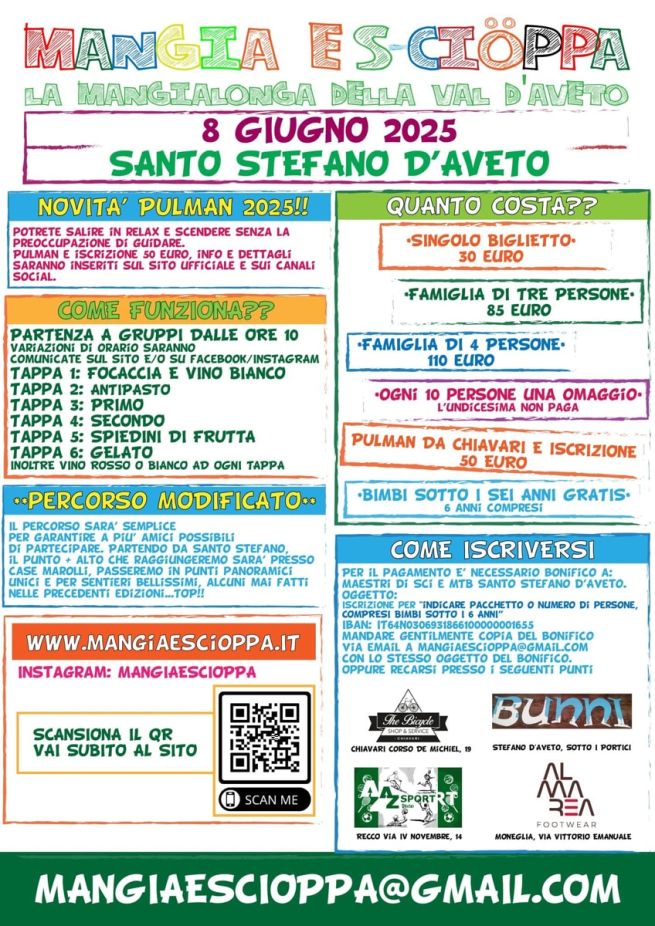 A ogni tappa è possibile scegliere vino bianco o rosso. Informazioni sul sito mangiaescioppa.it o sulla pagina facebook Mangia e Sciòppa della Val d'Aveto. In caso di maltempo, il programma potrebbe subire delle modifiche. Di seguito la locandina dell'evento.
