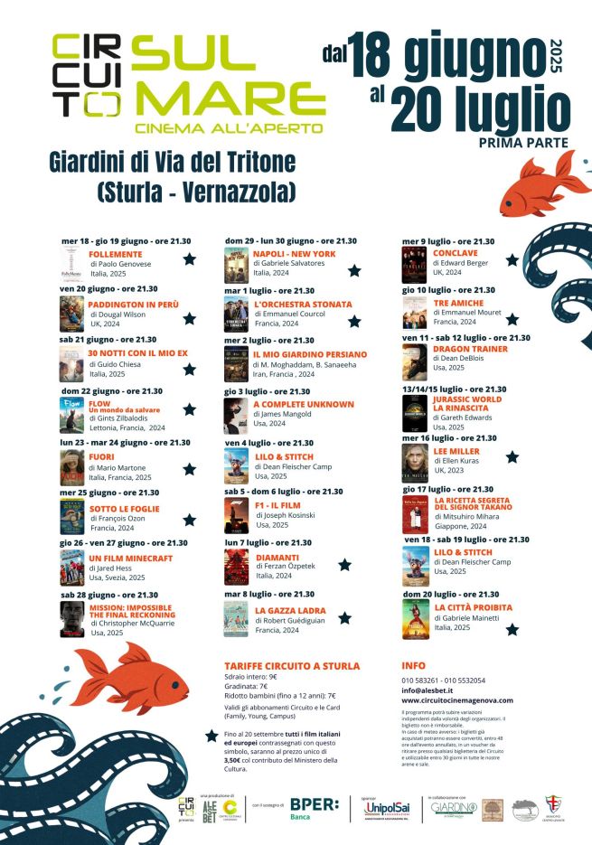 Da Follemente a La città proibita, passando per Flow e Lilo & Stitch, torna il cinema all'aperto con i migliori film della stagione da vedere sulle sdraio e con le cuffie. L'arena estiva Circuito sul Mare nei Giardini di Sturla (via del Tritone, Vernazzola) riapre mercoledì 18 giugno e prosegue tutti i giorni fino al 20 luglio 2025 con la prima parte del programma, arrivato alla quinta edizione. Una consuetudine per la città e i quartieri di levante, che l'anno scorso da luglio a metà settembre ha fatto registrare circa 10.000 spettatori.