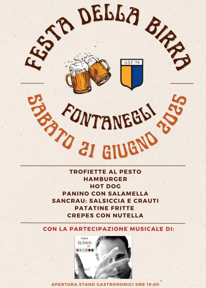 L'Unione Sportiva Fontanegli '74 APS organizza sul campo sportivo la Festa della Birra, in programma nella giornata di sabato 21 giugno 2025. Tanta allegria, musica, amici e voglia di trascorrere una fantastica serata in compagnia. Apertura degli stand gastronomici alle ore 19: si possono gustare trofiette al pesto, hamburger, hot dog, panino con salamella, salciccia e crauti, patatine fritte e crepes con nutella. Partecipazione musicale di Dj Ditch.