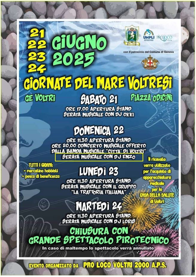 Parte del ricavato delle Giornate del Mare Voltresi 2025 viene utilizzato per l'acquisto di apparecchiatura medicale per la Casa della Salute di Voltri. Ulteriori informazioni sul gruppo facebook Pro Loco Voltri. Di seguito la locandina con il programma della manifestazione.