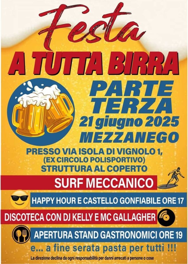 A mezzanego torna la Festa a Tutta Birra: l'evento si svolge sabato 21 giugno 2025 presso l'ex circolo polisportivo in via Isola di Vignolo 1. Happy Hour e castello gonfiabile dalle ore 17, intrattenimento con il surf meccanico e discoteca con Dj Kelly e Mc Gallagher. Apertura degli stand gastronomici alle ore 19 e pasta per tutti a fine serata. Di seguito la locandina dell'evento.