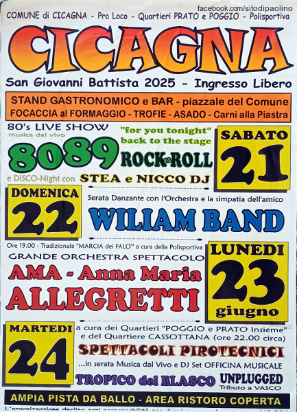 A Cicagna, in Val Fontanabuona, si festeggia San Giovanni Battista con quattro giorni di gastronomia, musica e intrattenimento. Appuntamento da sabato 21 a martedì 24 giugno 2025, con stand gastronomici e bar nel piazzale del Comune. Si possono gustare focaccia al formaggio, trofie, asado, carni alla piastra e non solo.