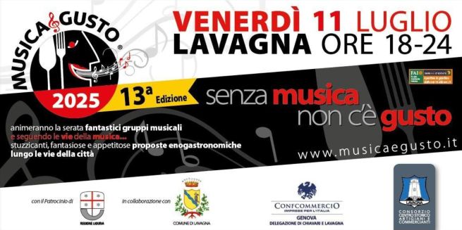 Venerdì 11 luglio 2025 a Lavagna torna Musica&Gusto dalle 18 alle 24 in collaborazione con il Comune di Lavagna e il patrocinio della Regione Liguria: prevista una serata di animazione con gruppi musicali e proposte enogastronomiche nelle vie cittadine.