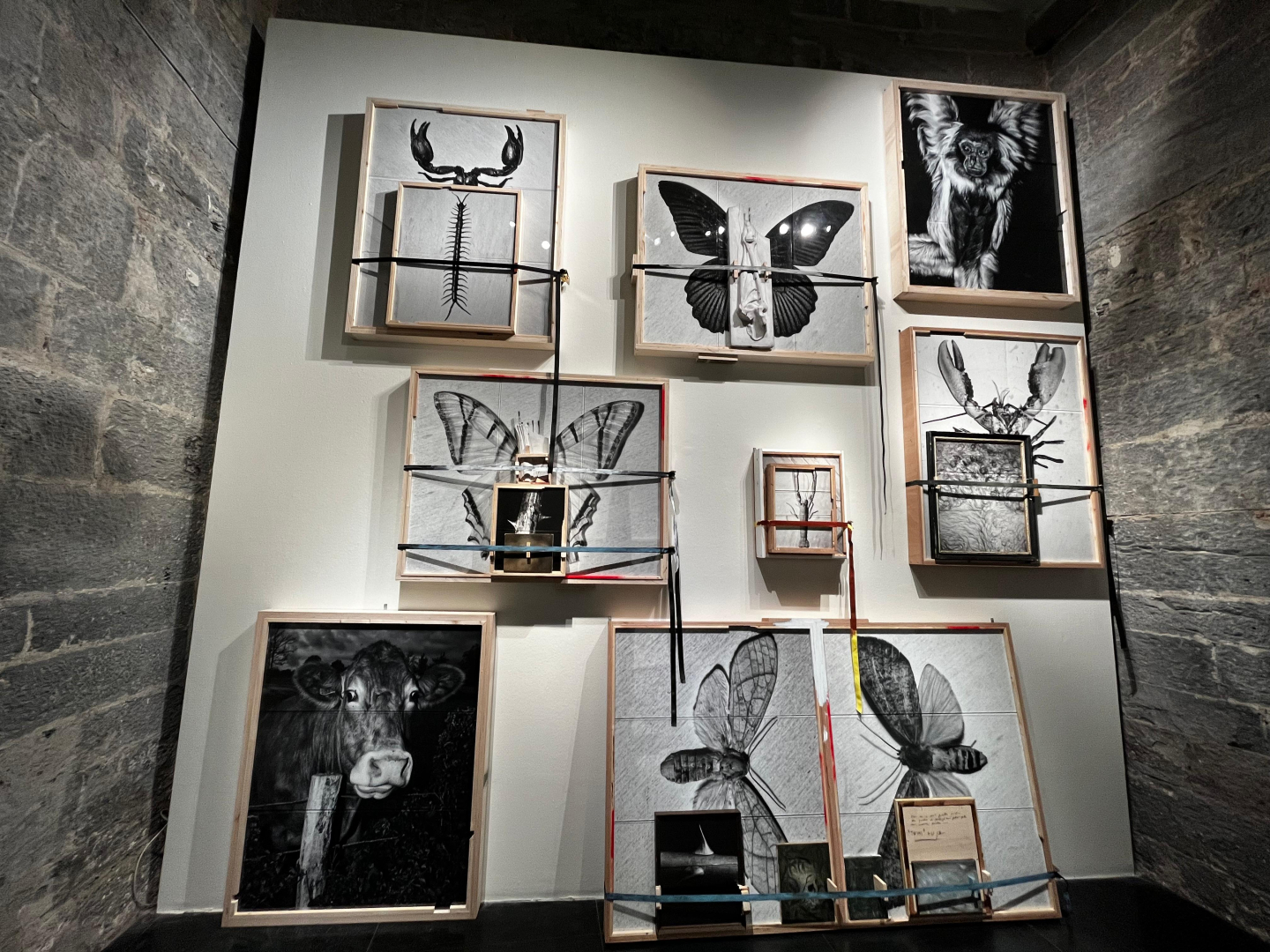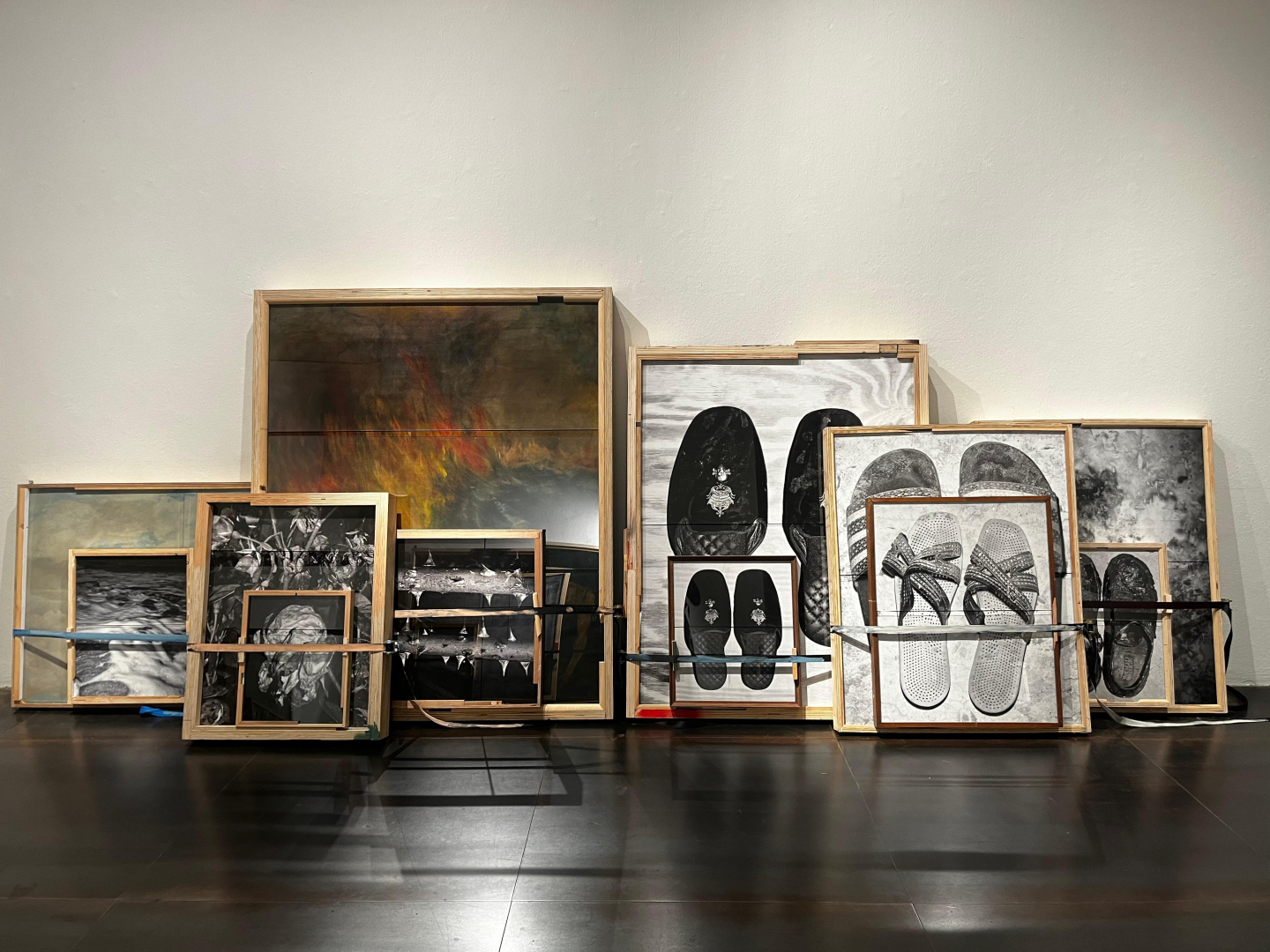 Nell’intenzione dell’artista di trasformare la fotografia in un oggetto fisico, si collocano le stratificazioni, una serie di opere che realizza dal 2022 sovrapponendo fotografie e dipinti, tenuti insieme da un sistema di cinghie e tensionatori. Qui il tema della molteplicità si somma a quello della cancellazione: dalla ipervisibilità di un mondo che Benassi ha sempre rischiarato con la luce di un flash si passa alla sua negazione. Eppure, non c’è contraddizione, perché Benassi ha sempre trattato la fotografia come gesto, evento, espressione di una volontà, prova di esistenza, al di là dell’immagine, spostando l’attenzione da ciò che si vede a tutto quello che sta intorno, sia dal lato dell’autore, sia dell’osservatore.