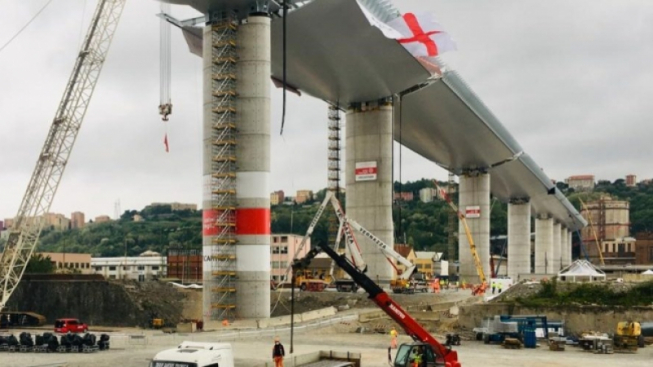 Un grande vascello bianco che attraversa la valle, Il Ponte, come lo ha ribattezzato Piano - che proprio come una nave è stato realizzato grazie al know-how di Fincantieri, gruppo leader nella navalmeccanica. Per la sua costruzione, sono state utilizzate 17.400 tonnellate d’acciaio, forgiate negli stabilimenti Fincantieri di tutta Italia grazie al lavoro di più di 800 persone. L’assemblaggio e la saldatura sono state possibili con l’impegno di ingegneri e tecnici specializzati della controllata Fincantieri Infrastructure - sino a 350 al giorno nei momenti di picco produttivo. Per completare l’impalcato sono serviti 19 sollevamenti, di cui 3 speciali per le maxi-campate da 100 metri l’una, che ad oltre 40 metri di altezza, hanno scavalcato il torrente Polcevera e la ferrovia. Operazioni che sono durate, nel caso dei sollevamenti speciali, anche 48 ore e che hanno richiesto attività preparatorie con squadre di oltre 50 persone all’opera e l’utilizzo di speciali macchinari come le maxi-gru e gli strand jack, apparecchiature necessarie per issare gli impalcati pesanti sino a 1800 tonnellate.