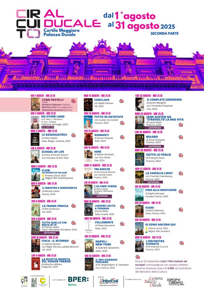 La nona edizione di Circuito al Ducale prosegue nel mese di agosto con cinque anteprime e una proiezione speciale con ospiti, più una selezione dei migliori titoli della stagione: Un programma che si conferma rivolto ai film d'autore e alle novità, con un'attenzione alle opere d’essai e alle cinematografie più originali da vedere all’aperto, nel Cortile Maggiore di Palazzo Ducale, tra le colonne dell’antica residenza dei Dogi, nel centro di Genova. Gli spettatori indossano le cuffie wifi, che permettono una fruizione protetta dai rumori esterni e nello stesso tempo non producono inquinamento sonoro. La stagione è organizzata da Circuito in collaborazione con Fondazione Palazzo Ducale ed Europa Cinemas, prodotta da Alesbet e Centro Culturale Carignano, con il sostegno di BPER: Banca. Sponsor UnipolSai.