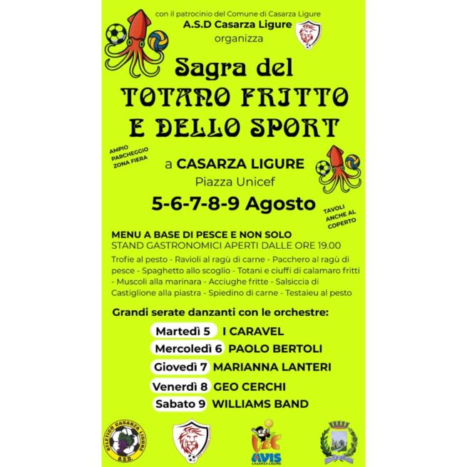 Torna, a Casarza Ligure, la tradizione Sagra del Totano. Una festa di cinque serate sulle alture di Sestri Levante aperta a tutti con piatti della tradizione e orchestre per il ballo e l'intrattenimento. Appuntamento da martedì 5 a sabato 9 agosto 2025, tutte le sere dalle ore 19 con menù a base di pesce e non solo, in piazza Unicef. Presenti tavoli anche al coperto.