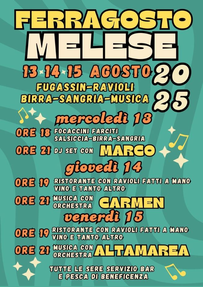 A Mele, sulle alture di Voltri, immancabile appuntamento con il Ferragosto Melese. Tre giornate di intrattenimento e gastronomia, da mercoledì 13 a venerdì 15 agosto 2025 negli spazi dell'Oratorio Sant'Antonio Abate. Di seguito il programma.