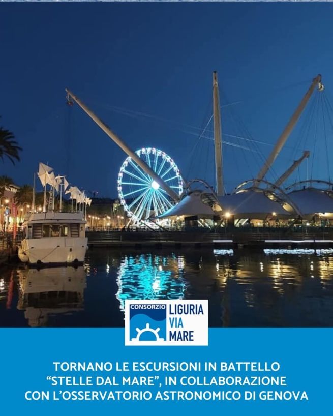 Tornano, per il quinto anno consecutivo, le escursioni in battello Stelle dal mare. L'iniziativa, in programma da venerdì 8 a martedì 12 agosto 2025, è nata dalla collaborazione tra i battelli del Consorzio Liguria Via Mare e l'Osservatorio Astronomico di Genova di via Superiore Gazzo a Sestri Ponente.