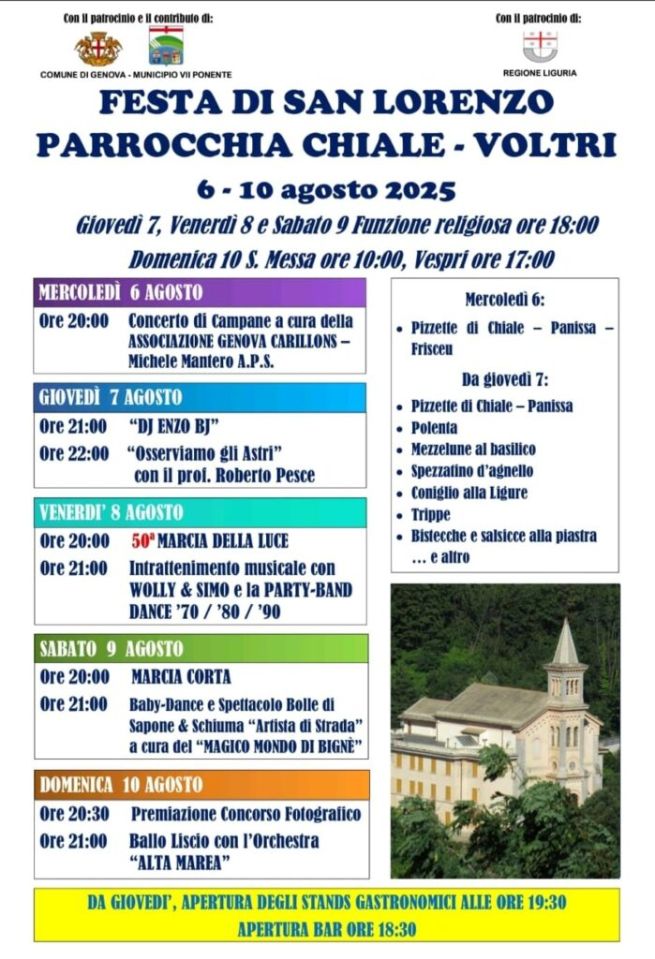 La parrocchia San Lorenzo di Chiale a Voltri comunica il programma dei festeggiamenti per i patrono. Di seguito tutti gli eventi e le celebrazioni.