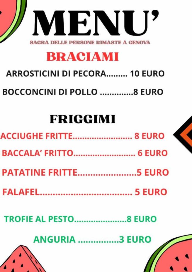 Si può trovare da bere, da mangiare, musica, giochi e banchetti. Per informazioni e aggiornamenti, consultare la pagina facebook dei Giardini Luzzati di Genova. Questo il menù presente in piazza: