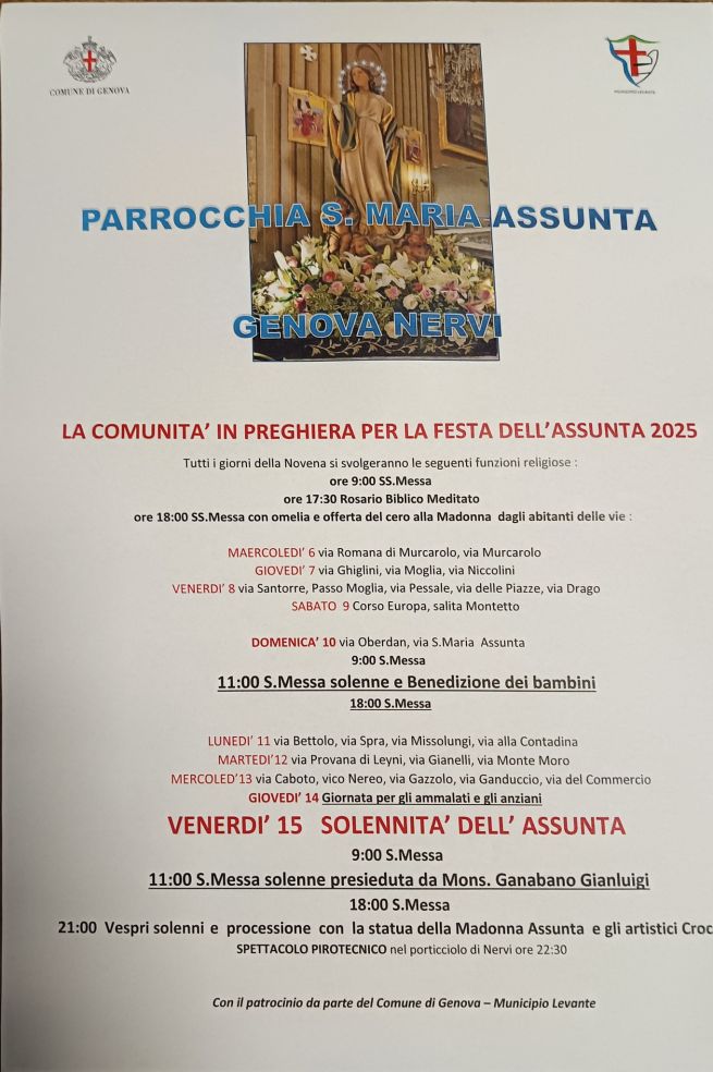 Venerdì 15 agosto 2025, la Festa dell'Assunta a Nervi entra nel vivo. Alle ore 9, Santa Messa a cura della Parrocchia Santa Maria dell'Assunta in via Oberdan presieduta da Mons. Gianluigi Ganabano. Nuova Santa Messa alle 18, mentre alle 21 vespri solenni e processione con la statua della Madonna Assunta e gli artistici crocifissi. La giornata di Ferragosto si conclude, alle ore 22.30 circa, con i fuochi d'artificio nel Porticciolo di Nervi.