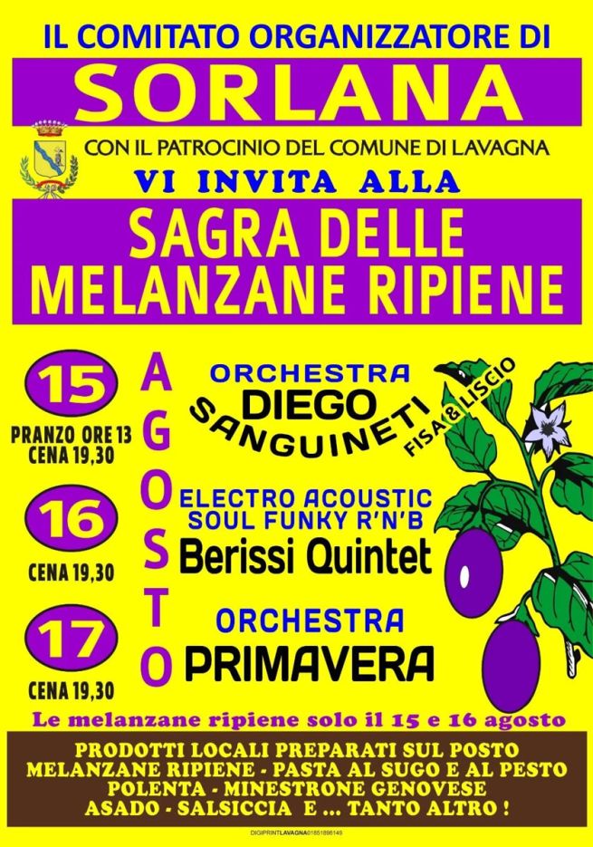 Tradizionale appuntamento con la Sagra delle melanzane ripiene di Sorlana (alture di Lavagna) con musica, balli e piatti tipici. Si parte venerdì 15 agosto (pranzo dalle ore 13, cena dalle 19.30), si prosegue sabato 16 e domenica 17 agosto 2025 solo a cena dalle 19.30. Ricco menù con prodotti locali preparati sul posto: melanzane ripiene, pasta al sugo e al pesto, polenta, minestrone, asado, salsiccia e tanto altro. Le melanzane ripiene sono disponibili nei giorni 15 e 16 agosto.