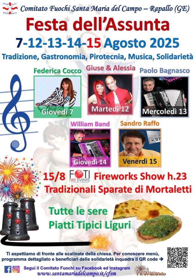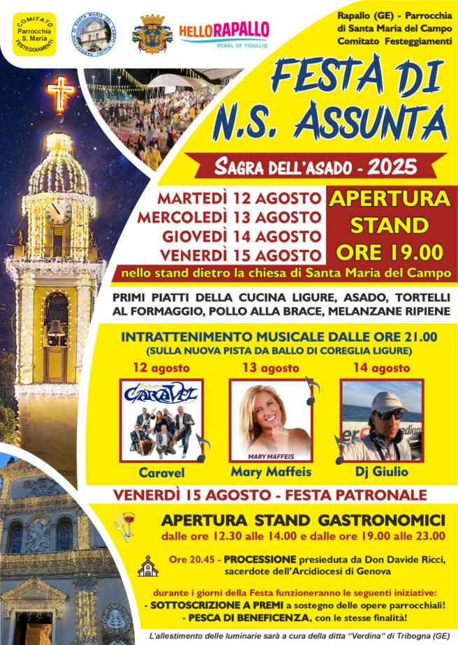 La Parrocchia di Santa Maria del Campo (Rapallo) organizza la Festa patronale dell'Assunta, celebrata da martedì 12 a venerdì 15 agosto 2025.