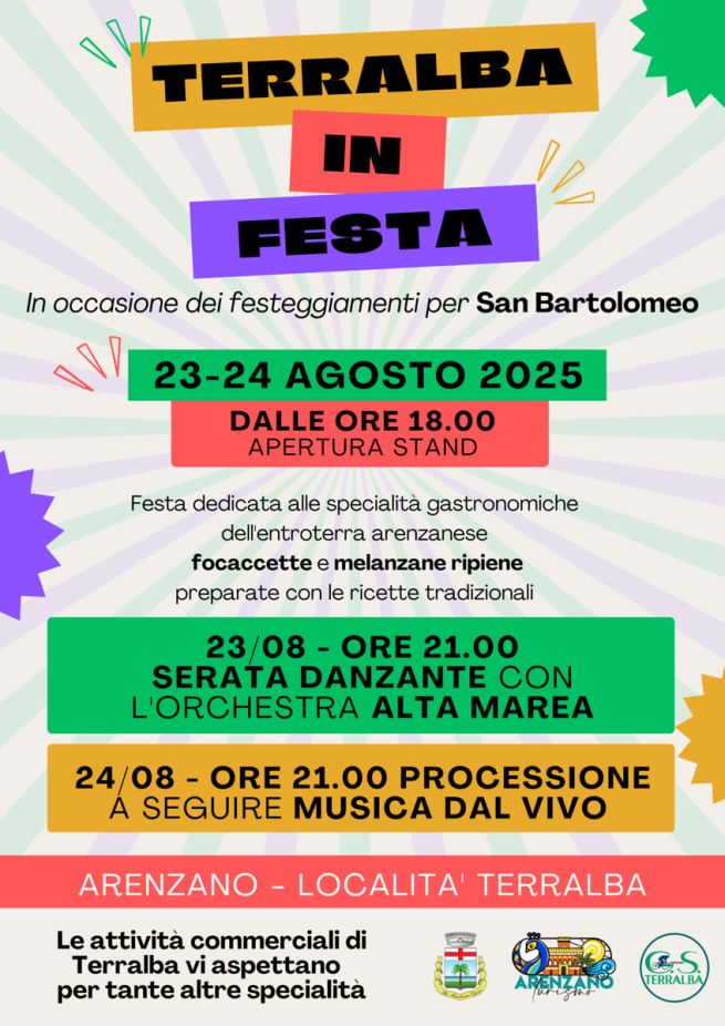 La frazione di Terralba (Arenzano) organizza la tradizionale celebrazione in occasione della Festa di San Bartolomeo con musica, gastronomia e bancarelle. Nel weekend di sabato 23 e domenica 24 agosto 2025, gli stand gastronomici aprono a partire dalle ore 18 con tante specialità gastronomiche dell'entroterra arenzanese, tra cui focaccette e melanzane ripiene preparate con le ricette tradizionali. In serata musica dal vivo, domenica alle 21 è in programma la processione. Di seguito la locandina dell'evento con il programma.