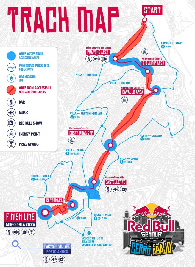 Si scende poi verso corso Carbonara, prima di svoltare in vico dell'Incarnazione e raggiungere il traguardo in largo della Zecca.Un tracciato pensato per valorizzare la straordinaria bellezza degli scorci su Genova e mettere a dura prova gli atleti in gara, esaltandone tecnica, coraggio e abilità nello ''spingere'' al massimo, in una sorta di ''dialogo'' tra l'unicità dei panorami della Superba e quella degli stunt dei rider che si cimentano con la gara. Di seguito la cartina con il tracciato.