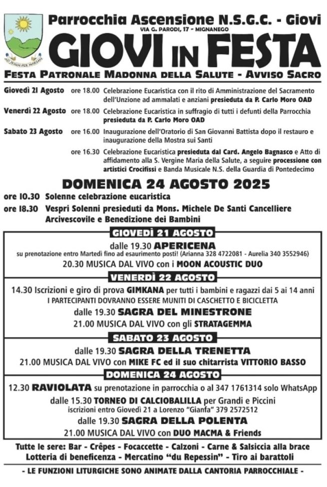 Giovi in festa per la Festa patronale dedicata alla Madonna della Salute, da giovedì 21 a domenica 24 agosto 2025 presso la Parrocchia dell'Ascensione in via Parodi 17 a Giovi (Mignanego). Si parte giovedì 21 agosto con l'apericena a partire dalle 19.30, su prenotazione entro martedì 19 agosto fino a esaurimento posti (contattare Arianna al 328 4722081 oppure Aurelia al 340 3552946); a seguire musica dal vivo con i Moon Acoustic Duo.