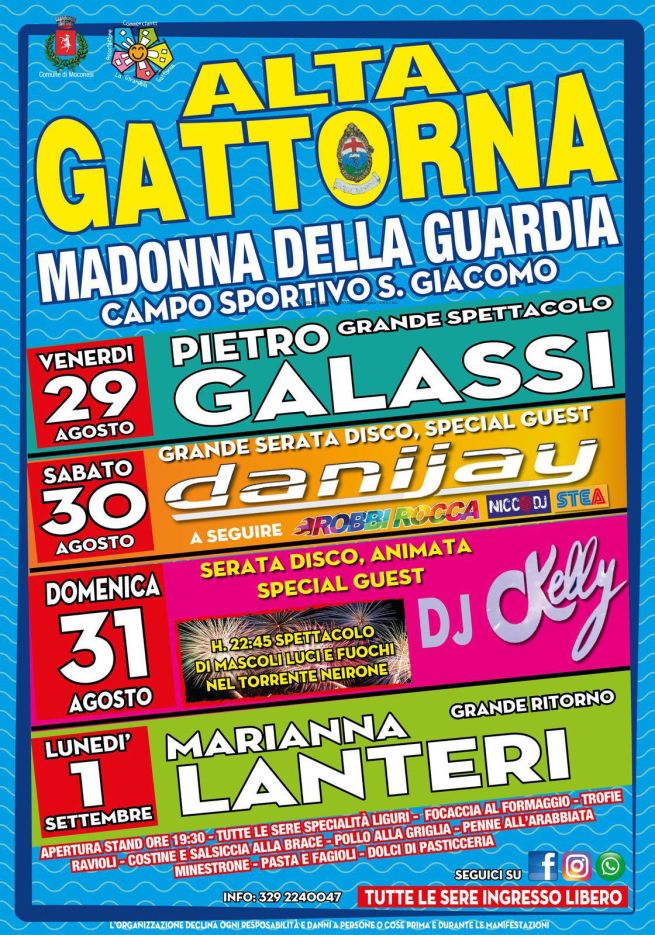 In particolare, per la festa della Madonna della Guardia a Gattorna, grande spettacolo con Pietro Galassi (venerdì 29 agosto); grande serata disco con ospite Danijay (sabato 30 agosto), serata disco animata con Dj Kelly e, alle 22.45 circa e meteo permettendo, spettacolo di mascoli, luci e fuochi d'artificio nel torrente Neirone (domenica 31 agosto). Infine, musica con Marianna Lanteri (lunedì 1 settembre). Tutte le serate sono a ingresso libero. Per ulteriori informazioni e aggiornamenti: pagina facebook Comitato Alta Gattorna - che organizza l'evento - o 329 2240047. Di seguito la locandina dell'evento.