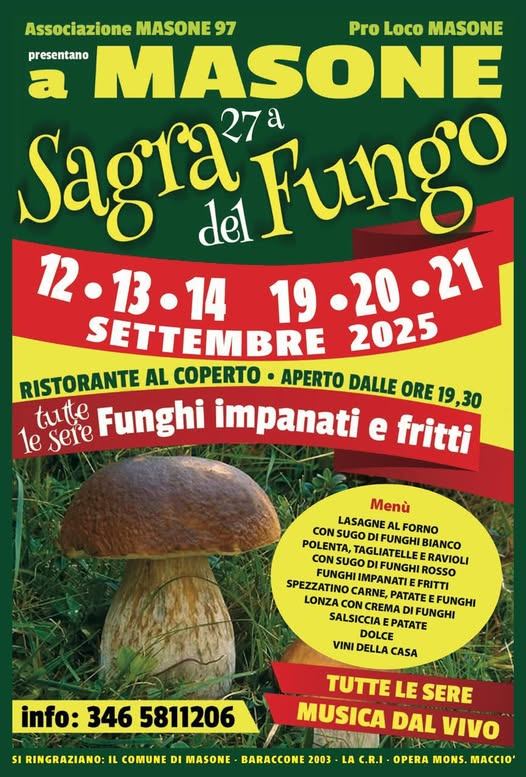 Il menù prevede lasagne al forno con sugo di funghi bianco; polenta, tagliatelle e ravioli con sugo di funghi rosso; spezzatino di carne, patate e funghi, lonza con crema di funghi, salsiccia e patate, dolce, vini della casa. Tutte le sere è possibile gustare i funghi impanati e fritti. Non manca la musica live durante tutte le sei serate della Sagra del Fungo di Masone. L'evento è a cura dell'Associazione Masone 97 e della Pro Loco Masone. Per informazioni 346 5811206 o pagina facebook Sagra del Fungo Masone o su quella della Pro Loco. Di seguito la locandina dell'evento.