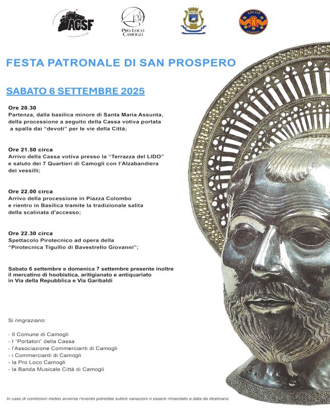 Si avvicina la festa patronale di San Prospero, in programma sabato 6 settembre 2025 a Camogli. Alle 20.30 circa parte la processione con la cassa del Santo con arrivo in piazza Colombo e rientro in Basilica e, alle ore 22.30 circa, c'è lo spettacolo pirotecnico organizzato dalla Pirotecnica Tigullio di Bavestrello Giovanni. I fuochi d'artificio, in caso di maltempo o condizioni meteo avverse, potrebbero essere rimandati.