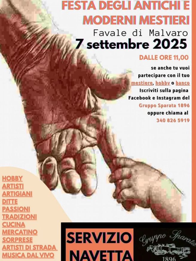 Domenica 21 settembre 2025 torna la Festa degli Antichi e Moderni Mestieri a Favale di Malvaro, ai piedi della Scoglina. Dalle ore 11, un viaggio tra tradizione e innovazione con artisti, artigiani, hobby e passioni, cucina tipica, mercatino, artisti di strada e musica dal vivo. La fiera era inizialmente in programma il settembre scorso, ma causa alluvione in Val Fontanabuona è stata rimandata.