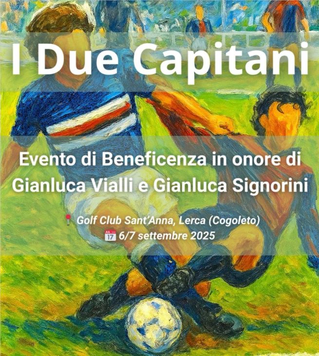 Una grande festa di sport e solidarietà per onorare la memoria di due leggende del calcio genovese e italiano, Gianluca Vialli e Gianluca Signorini. I Due Capitani, evento organizzato da CNA Genova ed ECIPA, insieme al Rotary Club Turchino e al Golf Club Sant'Anna, è proprio questo. L'appuntamento è sabato 6 e domenica 7 settembre al Golf Club Sant'Anna di Lerca, sulle alture di Cogoleto.
