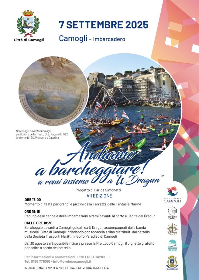 Andiamo a barcheggiare! A remi, insieme a U Dragun: nella giornata di domenica 7 settembre 2025, a partire dalle ore 17, torna uno degli eventi clou del calendario camogliese, ideato dalla storica dell’arte Farida Simonetti e promosso dall’Amministrazione comunale in collaborazione con la Golfo Paradiso, il gruppo U Dragun e la Scuola Musicale Banda "Citta' Di Camogli" G.Puccini. Di seguito il programma: